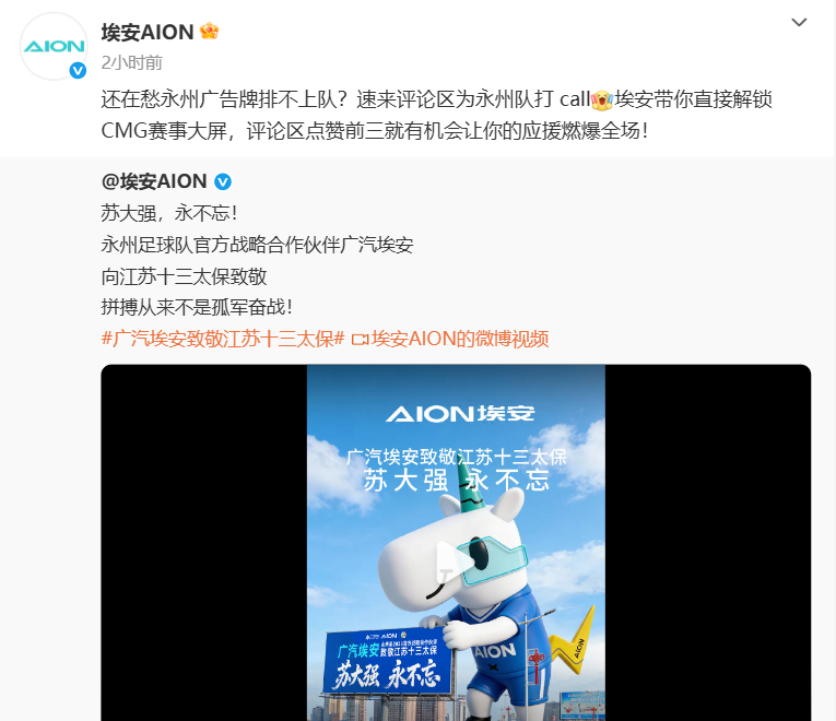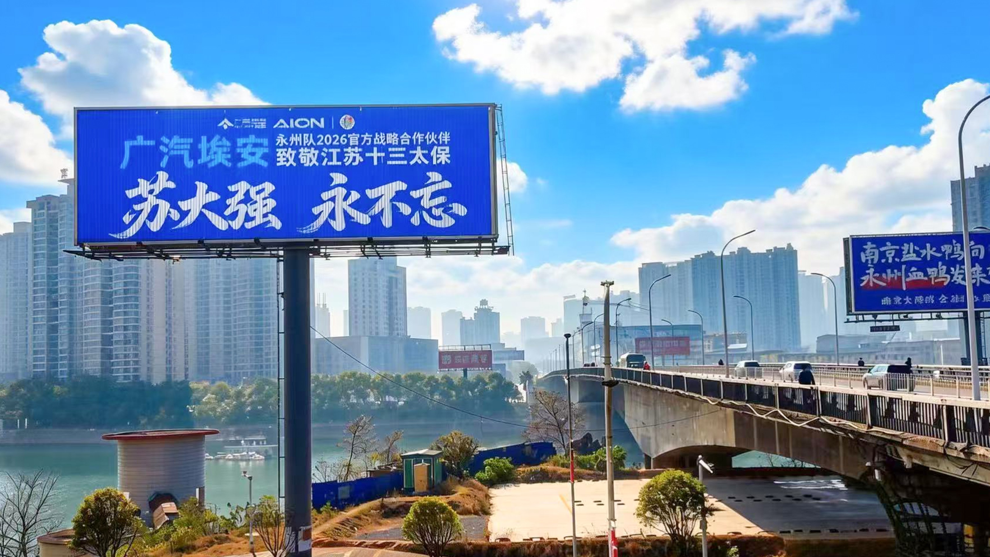 在这场引起全网关注的比赛中,网友都在为永州队加油鼓舞。埃安作为官方合作伙伴,不仅此前在永州登广告牌致敬江苏十三太保,此次还将进行带网友上广告大屏的行动,征集网友的应援打call评论。